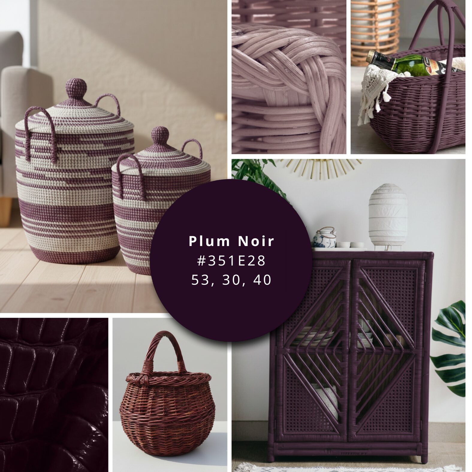 Use Plum Noir in lacquerware boxes, candle holders, or intricate baskets. It pairs well with gold hardware, mother-of-pearl detailing, or deep walnut finishes. The color of the year, Cloud Dancer, works well as a soft balance to Plum Noir’s intensity.