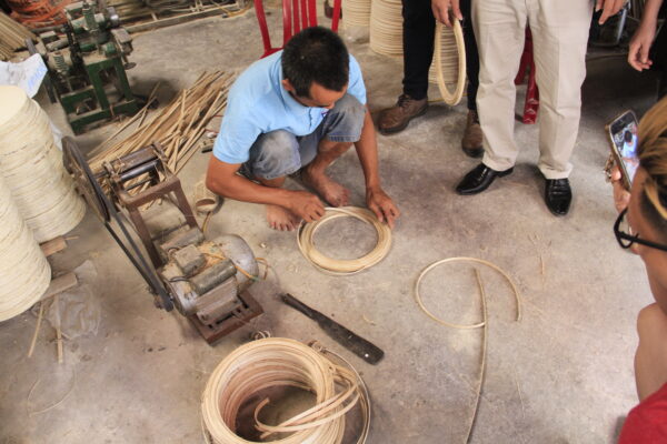 In family workshops, artisans hand-chop the soaked bamboo bars into smaller slats, typically 1–2 cm wide, depending on the product. They then skin and bend these slats into curved rings using simple machines that carve deep grooves into the bamboo. These grooves help the glue penetrate better, creating a stronger, more durable bond for the finished product.