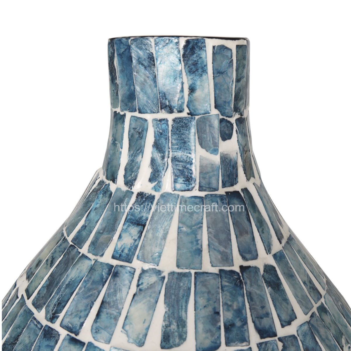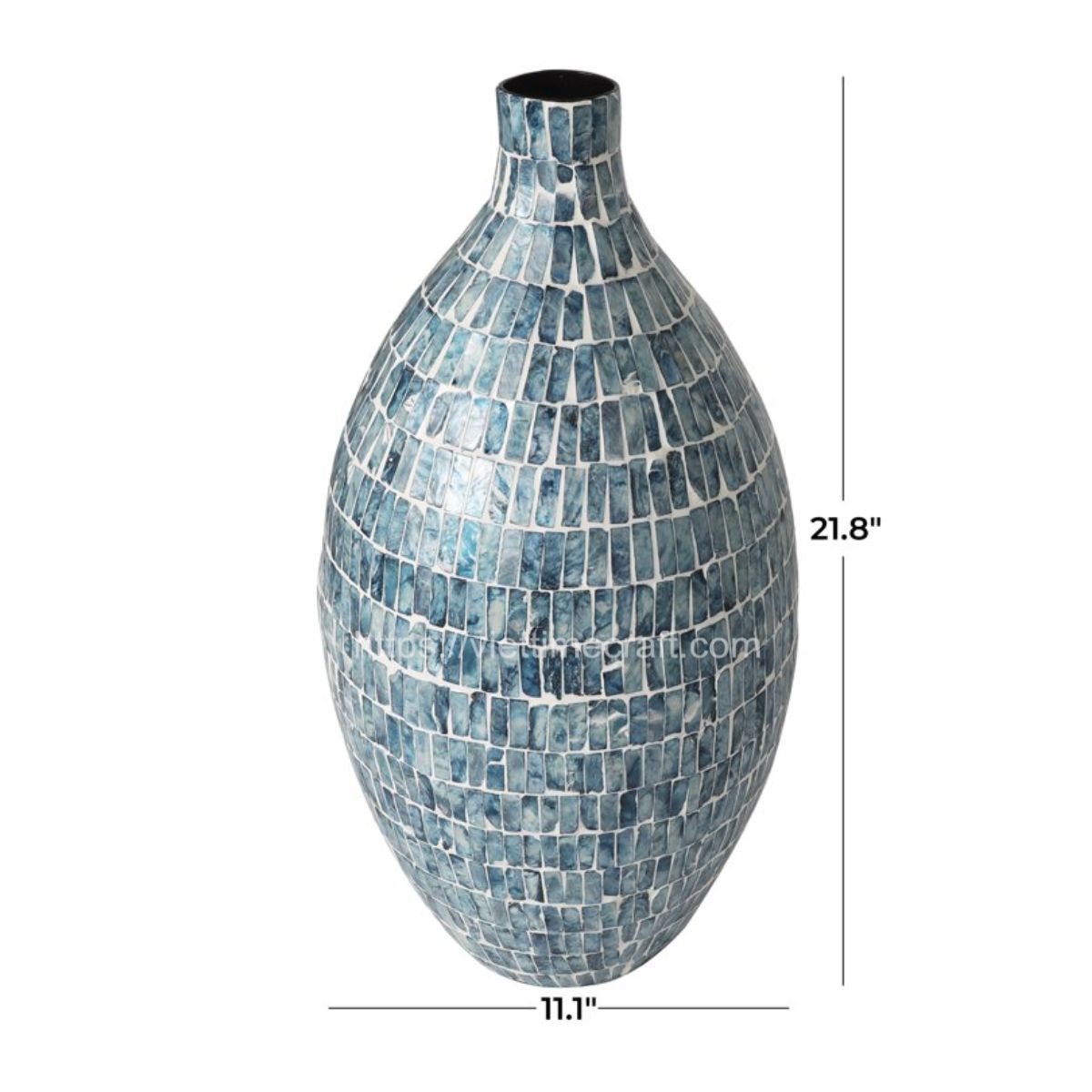 - Handcrafted from high-quality mother of pearl shells, this blue mosaic vase combines durability with elegance. Its contemporary design features a stunning blend of glossy light blue, dark blue, and cream hues, adding a touch of sophistication to your home.