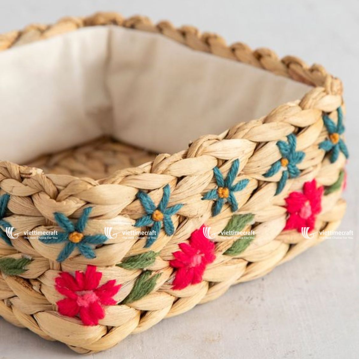 Artisans from Viettimecraft beautifully handcraft this elegant water hyacinth storage tray. The tray is square-shaped, woven with natural water hyacinth fibers, and features intricate embroidery with vibrant flowers in red and blue. Its light-colored fabric lining adds a touch of softness and refinement to its rustic and traditional design.