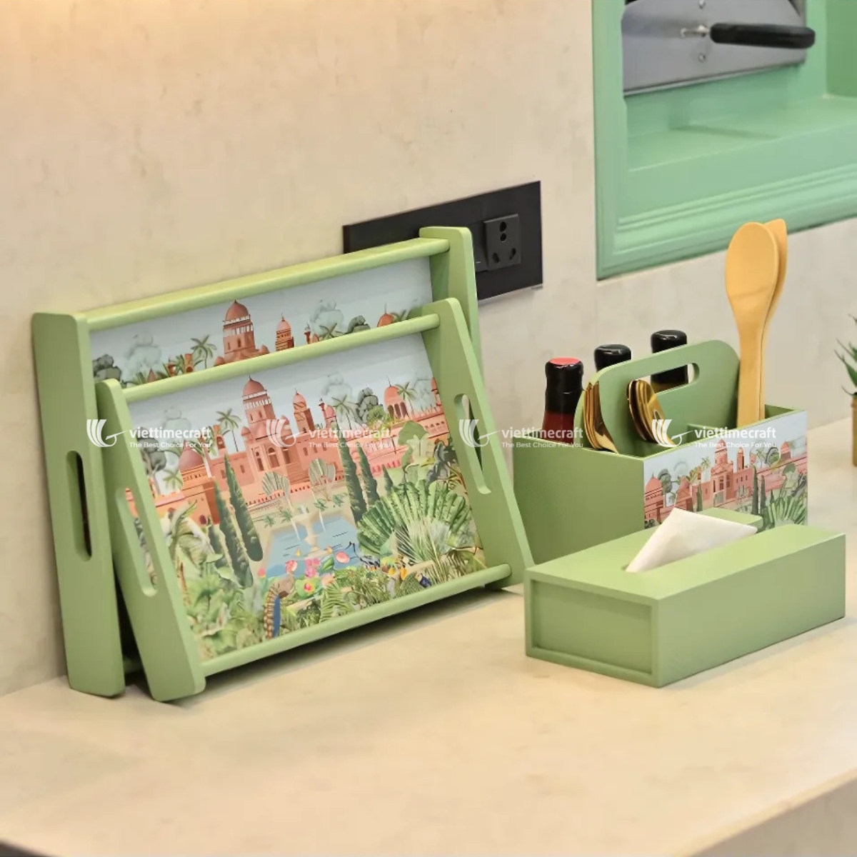 Add charm and functionality to your home with this elegant lacquer kitchen organizer set featuring oriental artwork – perfect for trays, cutlery, condiments, and tissue storage.