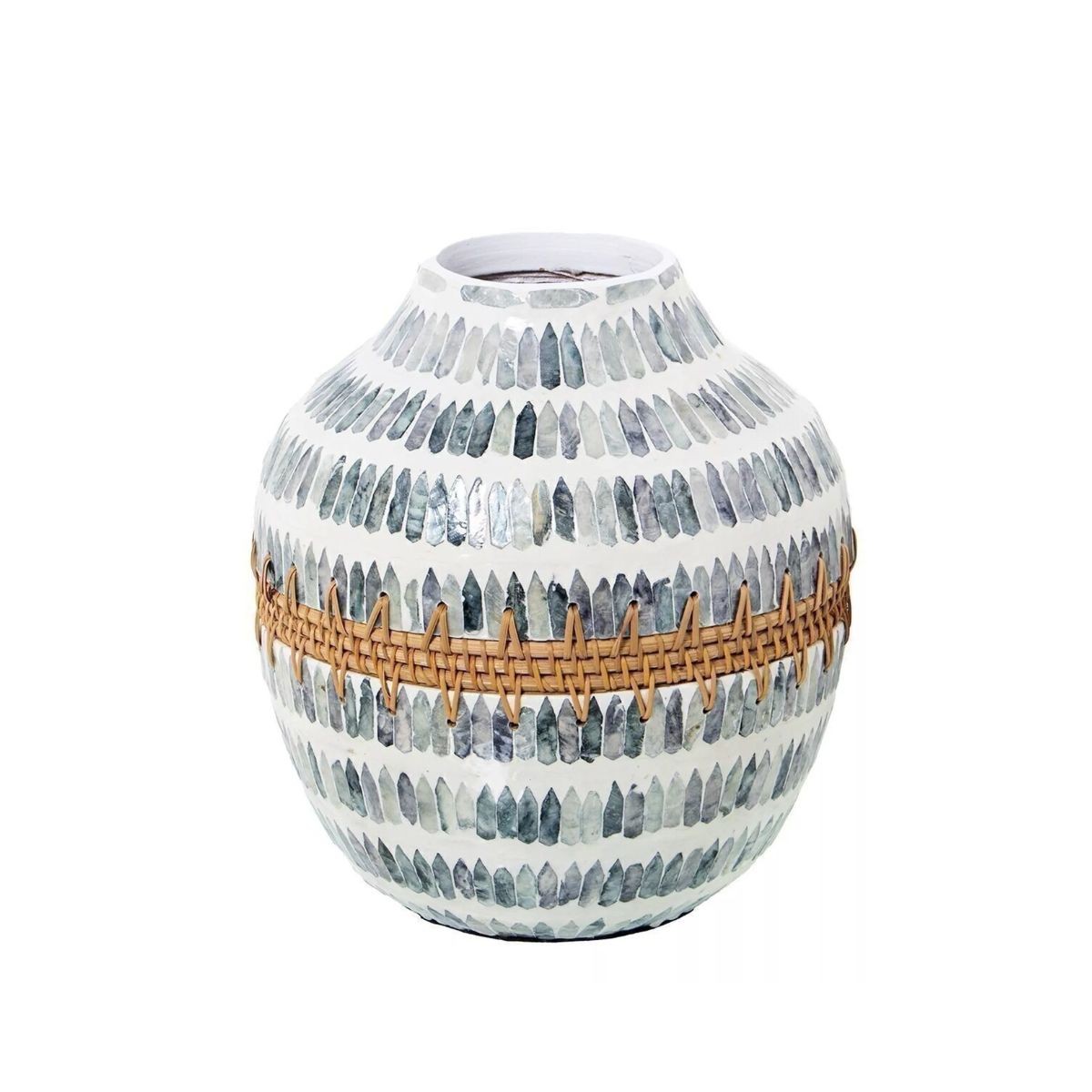 - Handcrafted from premium mother-of-pearl shells, this blue mosaic vase seamlessly blends durability with elegance. Its modern design showcases a captivating mix of glossy light blue, dark blue, and cream tones, infusing your home with sophistication.