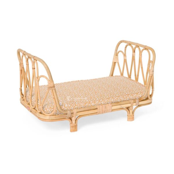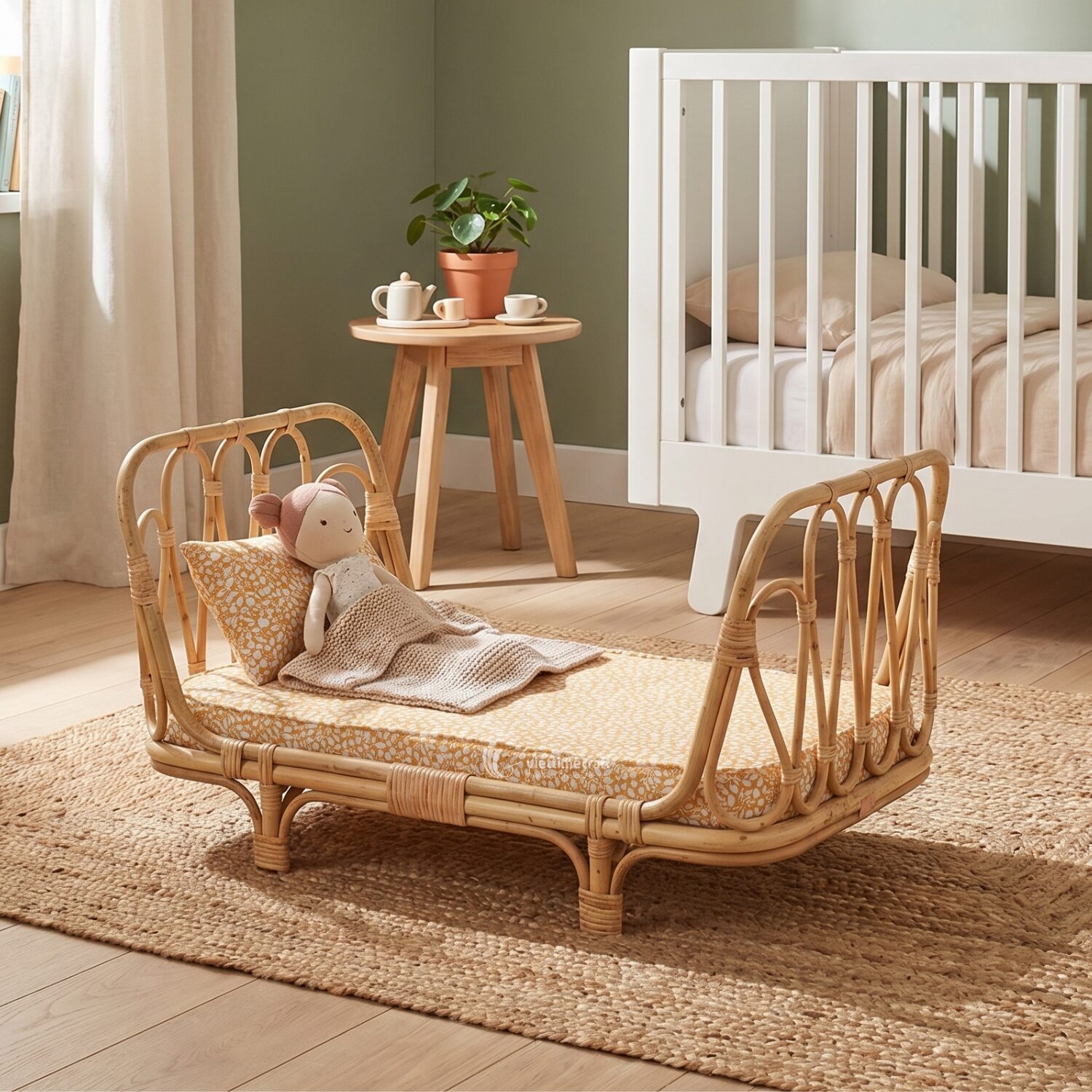 The design features a comfortable mattress available in soft sage or mustard floral patterns, providing a cozy resting place for favorite dolls and plush toys. Furthermore, the stable four-legged base ensures the wicker doll crib remains secure during playtime. Consequently, this piece acts as both a functional toy and a stunning decorative accent that elevates the overall look of a child’s bedroom.
