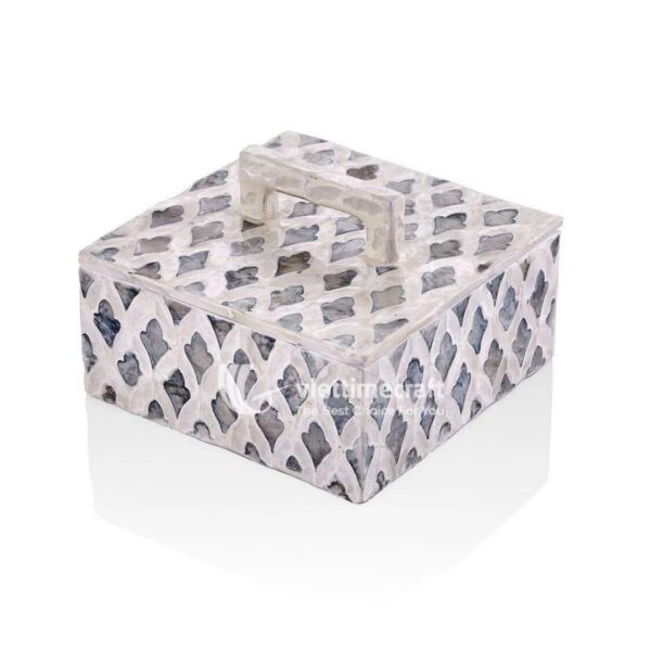 Introduce a touch of timeless elegance to your collection with our Mother of Pearl Mosaic Inlaid Box. This exquisite mosaic box represents the pinnacle of Vietnam handicraft, where traditional artistry meets modern luxury. The design showcases a sophisticated geometric pattern, alternating between luminous white and deep charcoal grey tiles. Furthermore, the sturdy lid includes a matching inlaid handle, making it as functional as it is beautiful. Whether you use it as a pearl box for your finest jewelry or a mother of pearl decorative box for your vanity, this piece instantly elevates the aesthetic of any interior space.