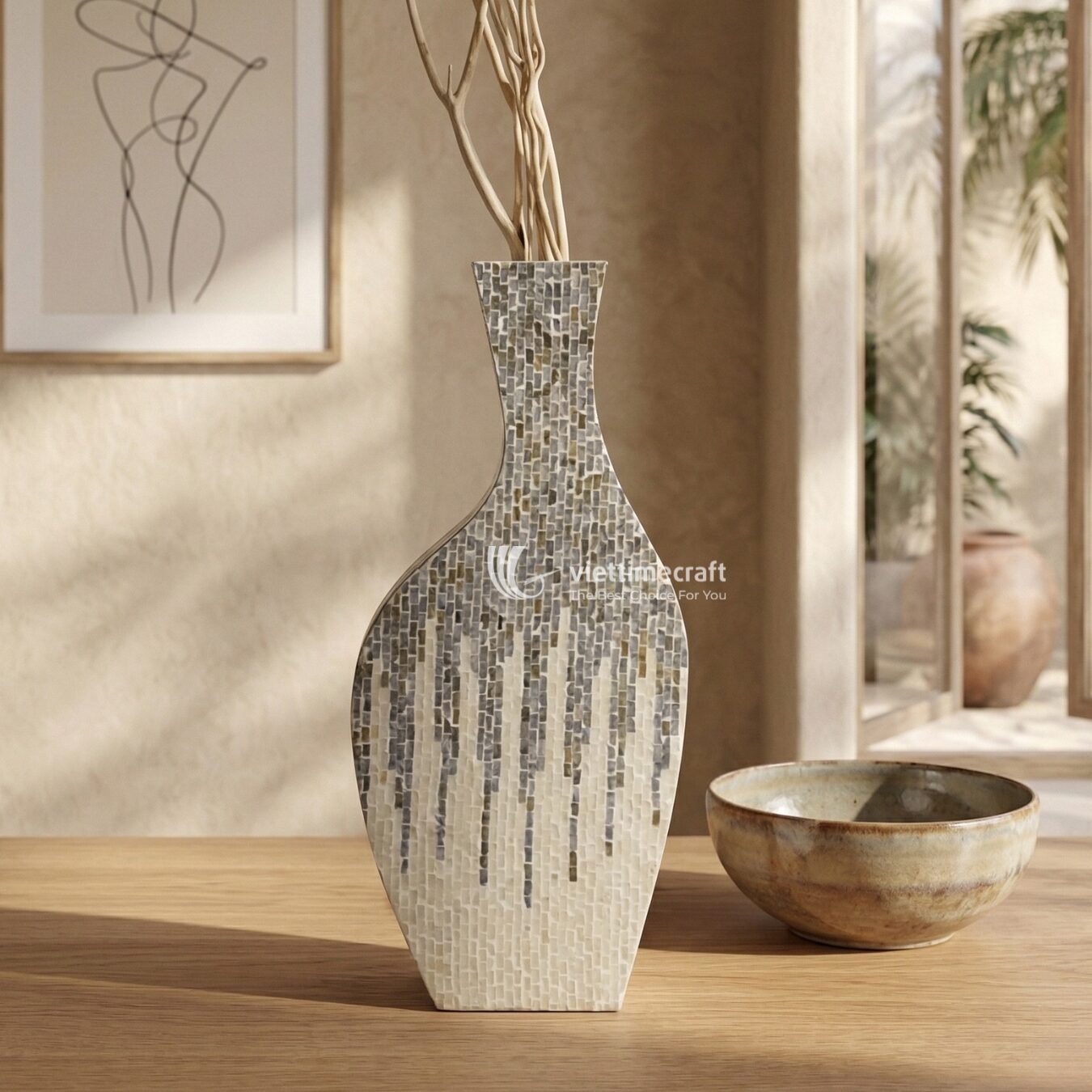 This mosaic vase offers exceptional versatility for professional interior designers and high-end boutiques: