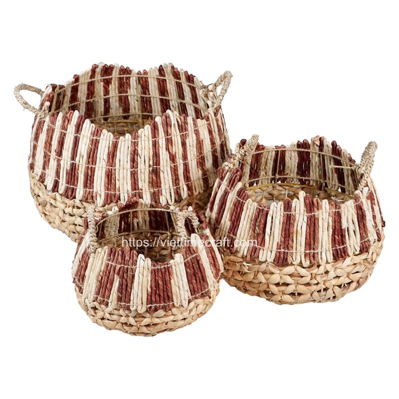 - From durable water hyacinth – known for its natural texture and strength. The thin weaving pattern adds an elegant touch to the baskets while maintaining their sturdiness.