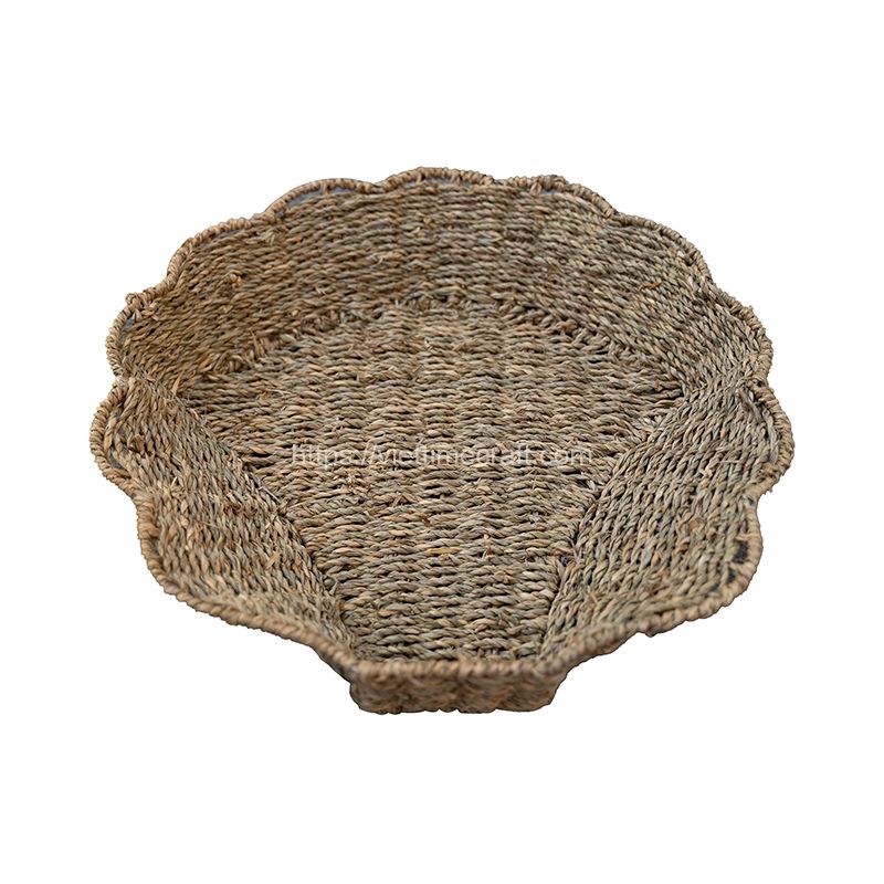 A scalloped style seagrass tray refers to a tray made from seagrass that is designed in the shape of a seashell.