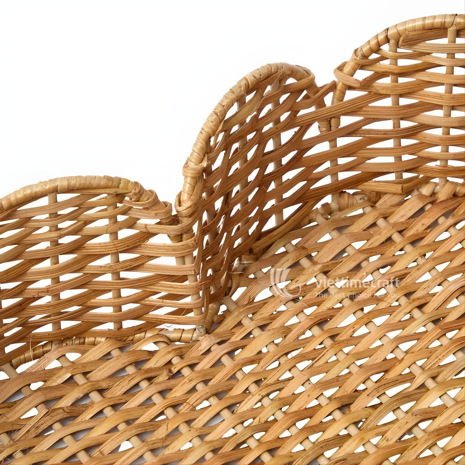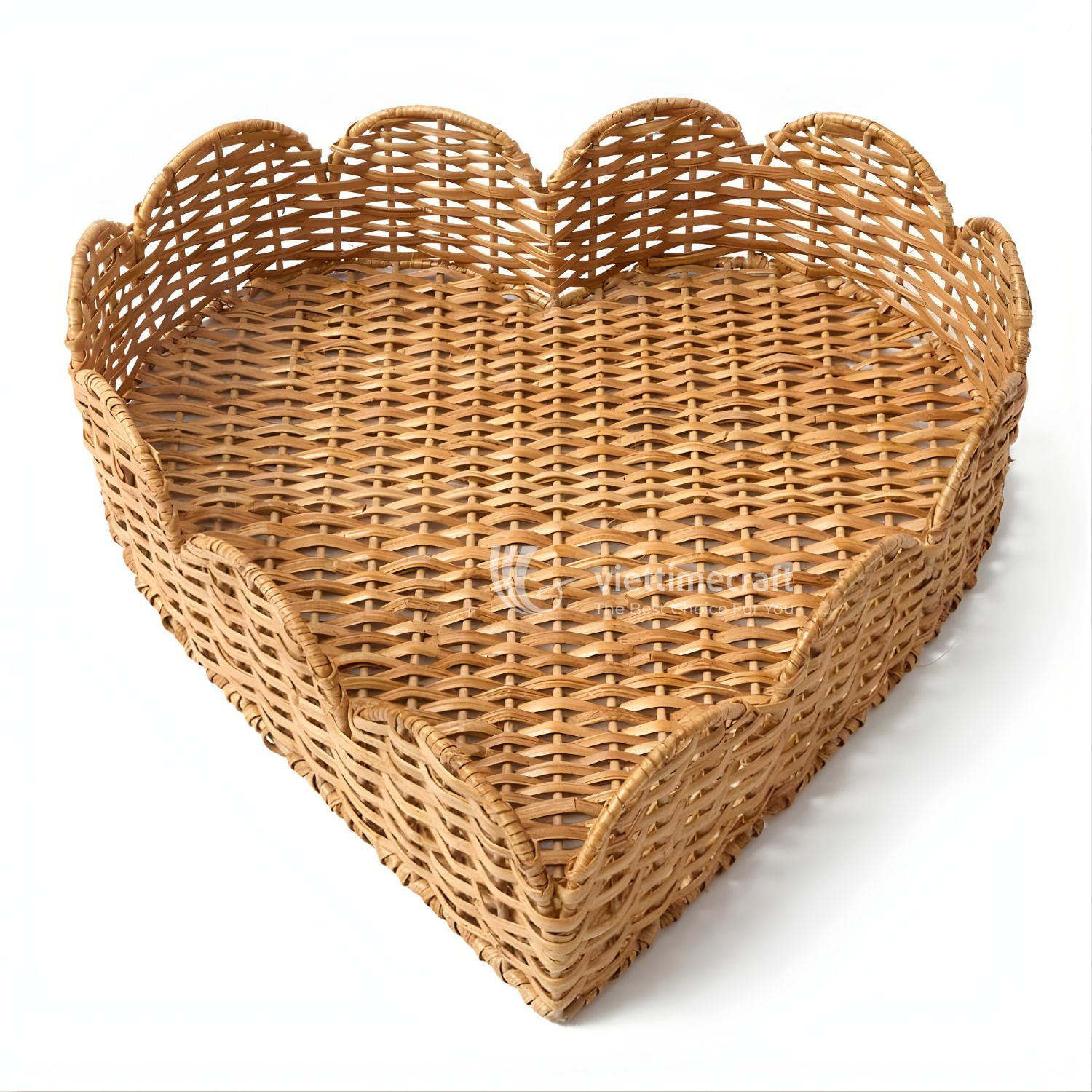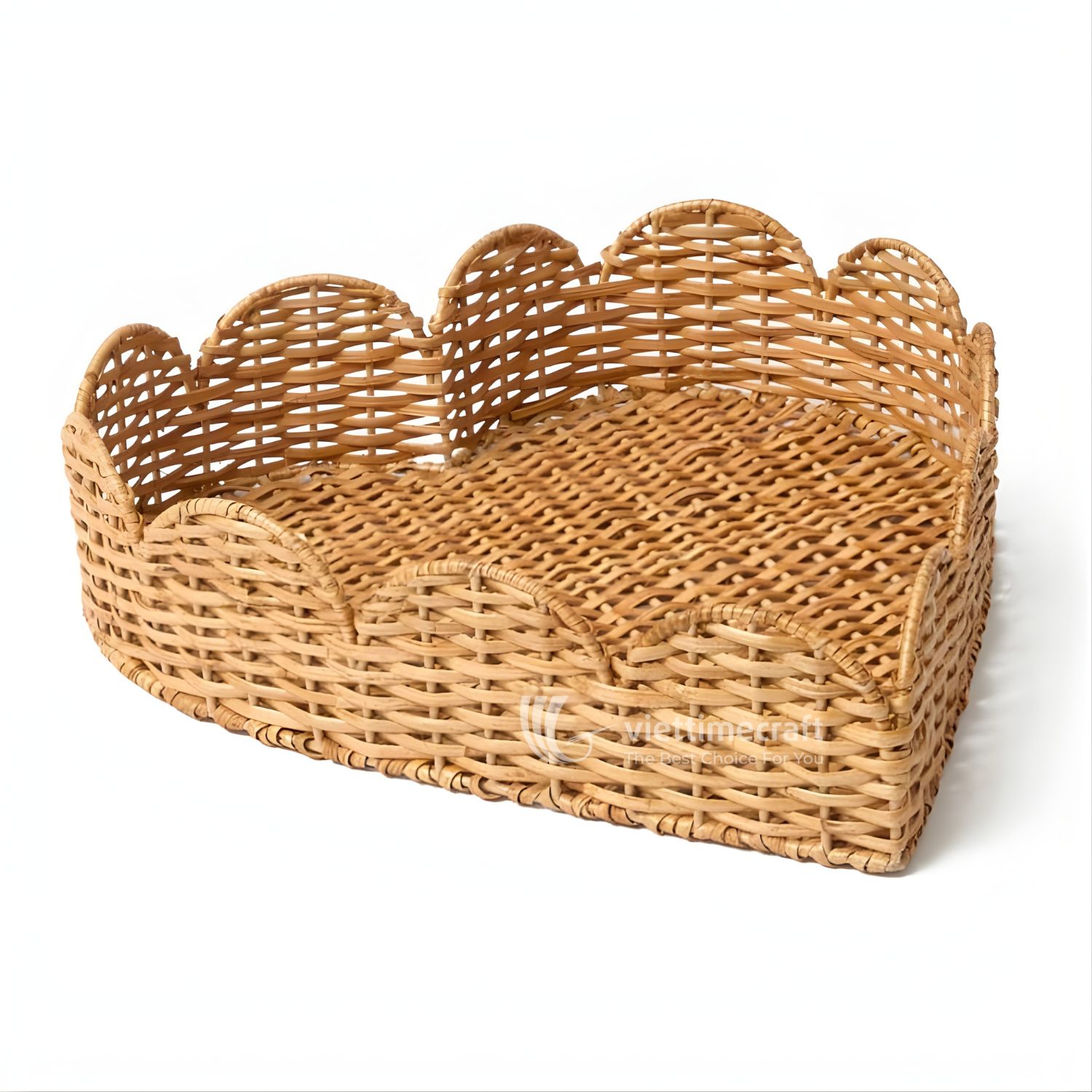 This heart scalloped rattan tray is handcrafted from natural rattan by skilled Vietnamese artisans, featuring a distinctive scalloped edge that adds softness and visual rhythm to the overall design. Unlike standard flat trays, the curved, petal-like rim creates a decorative silhouette while still maintaining full functionality for everyday use.