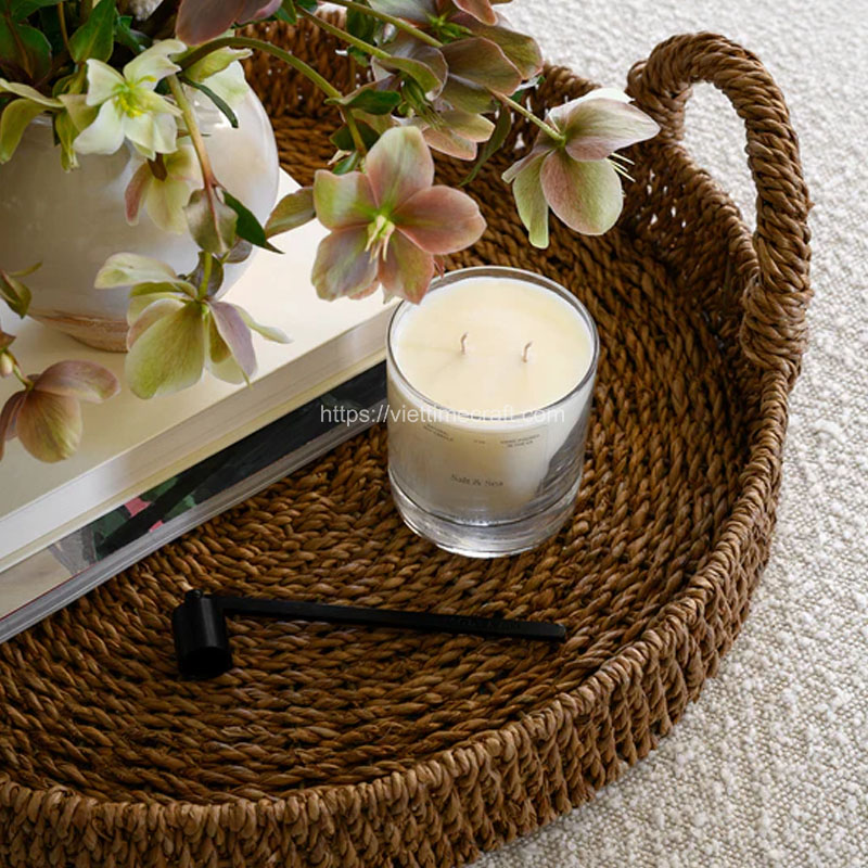- Place the seagrass tray on a coffee table, ottoman, or countertop as a decorative centerpiece. You can arrange candles, vases, or other decorative objects on the tray to create an eye-catching display.
