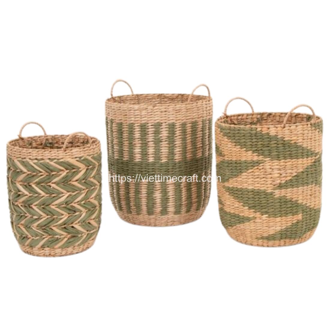 - From durable water hyacinth – known for its natural texture and strength. The thin weaving pattern adds an elegant touch to the baskets while maintaining their sturdiness.