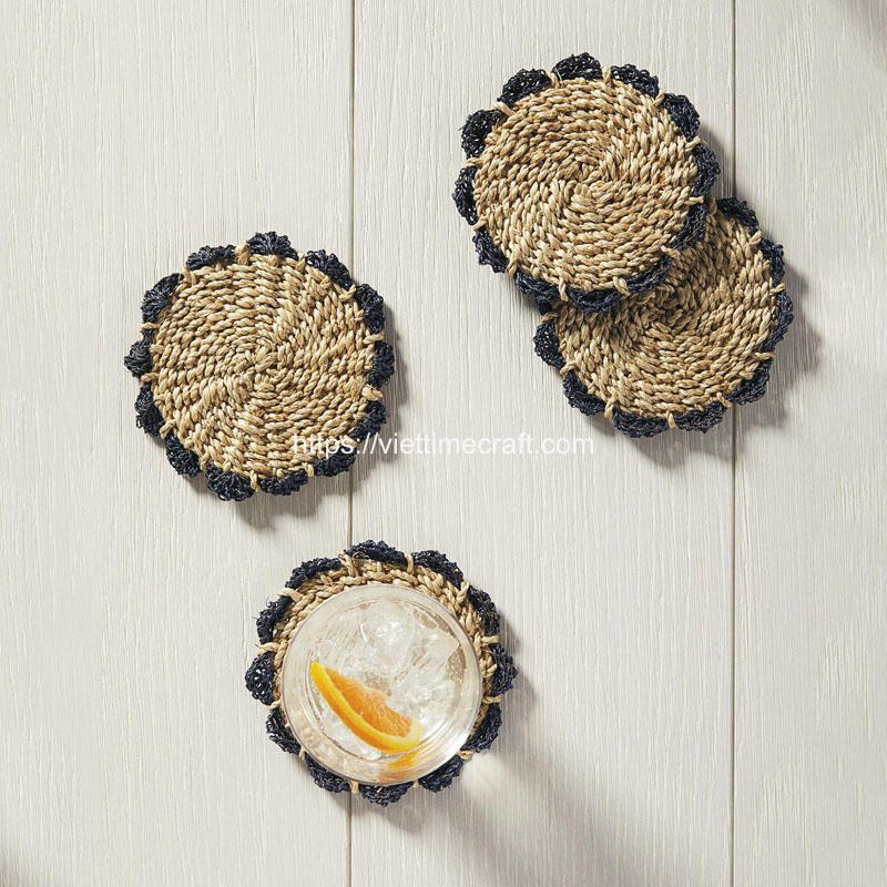 A seagrass coaster set of 4 is a collection of four individual coasters made from seagrass materials. Similar to the seagrass placemats, seagrass coasters offer a natural and eco-friendly option for protecting surfaces from drink condensation or heat.
