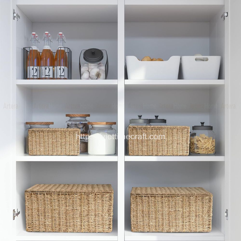 Woven set of 4 seagrass baskets with lids and handles is a popular choice for organizing various items in a stylish and eco-friendly way. Furthermore, it significantly reduces the required shipping space, allowing you to maximize cost savings. These seagrass storage baskets are meticulously created by skilled artisans, who pour their craftsmanship and attention to detail into every piece.