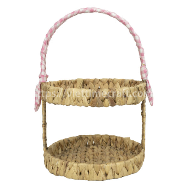 Our two-tier wicker tray with decorative ribbon bows are ideal for wholesale buyers, including home décor brands, gift packaging suppliers, and event organizers. Made from 100% natural water hyacinth, each piece is handwoven by skilled Vietnamese artisans and finished with a charming ribbon, making it perfect for both display and storage.