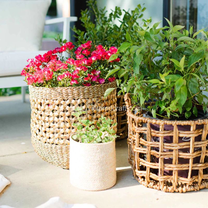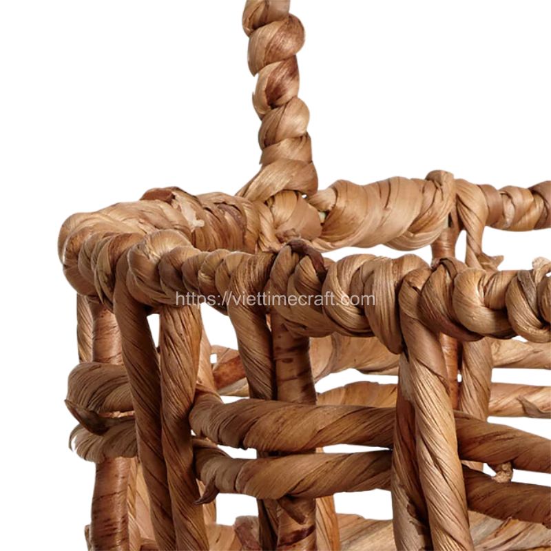 - From durable water hyacinth – known for its natural texture and strength. The thin weaving pattern adds an elegant touch to the baskets while maintaining their sturdiness.