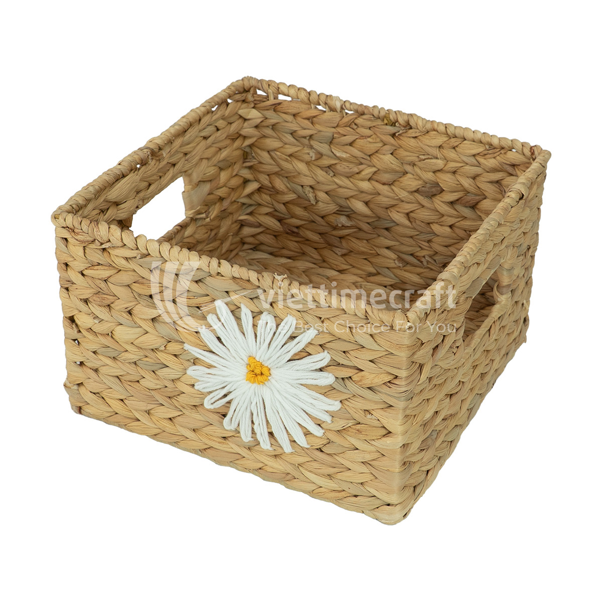 Crafted from sustainably harvested water hyacinth by skilled Vietnamese artisans, this set is both eco-friendly and highly functional. The natural golden tones of the hyacinth material complement the soft white embroidered daisy flowers, creating a soothing, country-style aesthetic that enhances any décor.