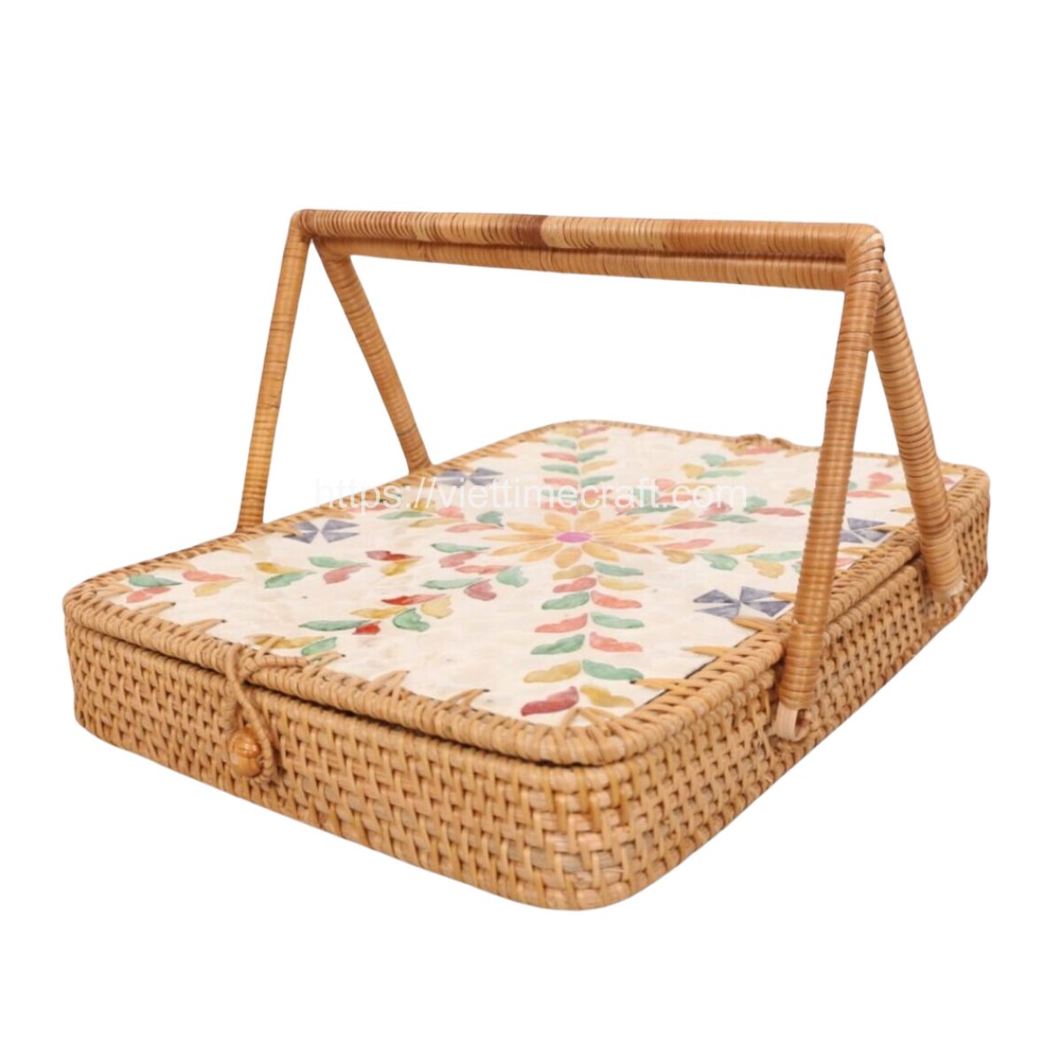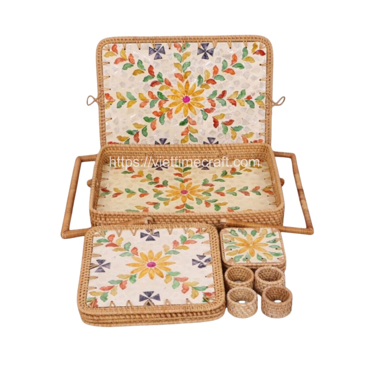 Our product is expertly handcrafted by skilled artisans, featuring designs made from natural rattan and genuine mother of pearl. It is finished with a health-safe PU varnish for added protection. The set includes the following items: