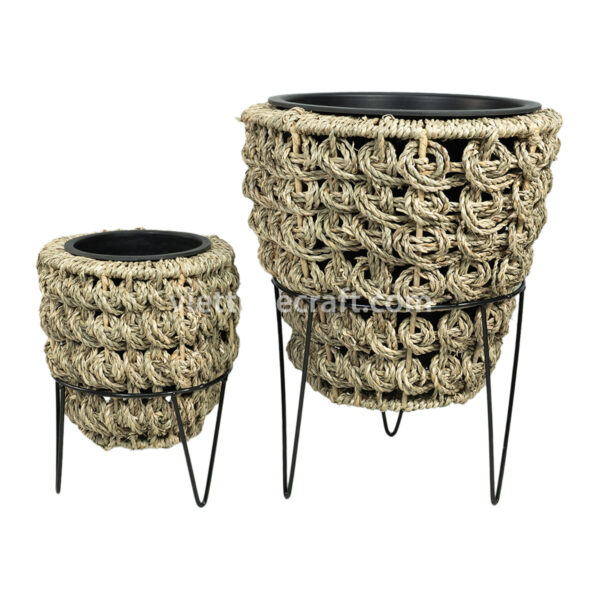 • Product name: Handcrafted seagrass planter with metal stand and bold 3D loop pattern.